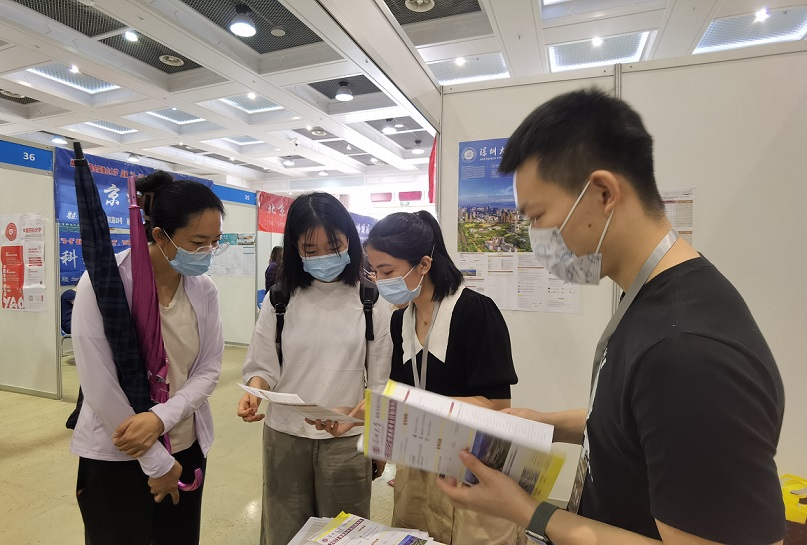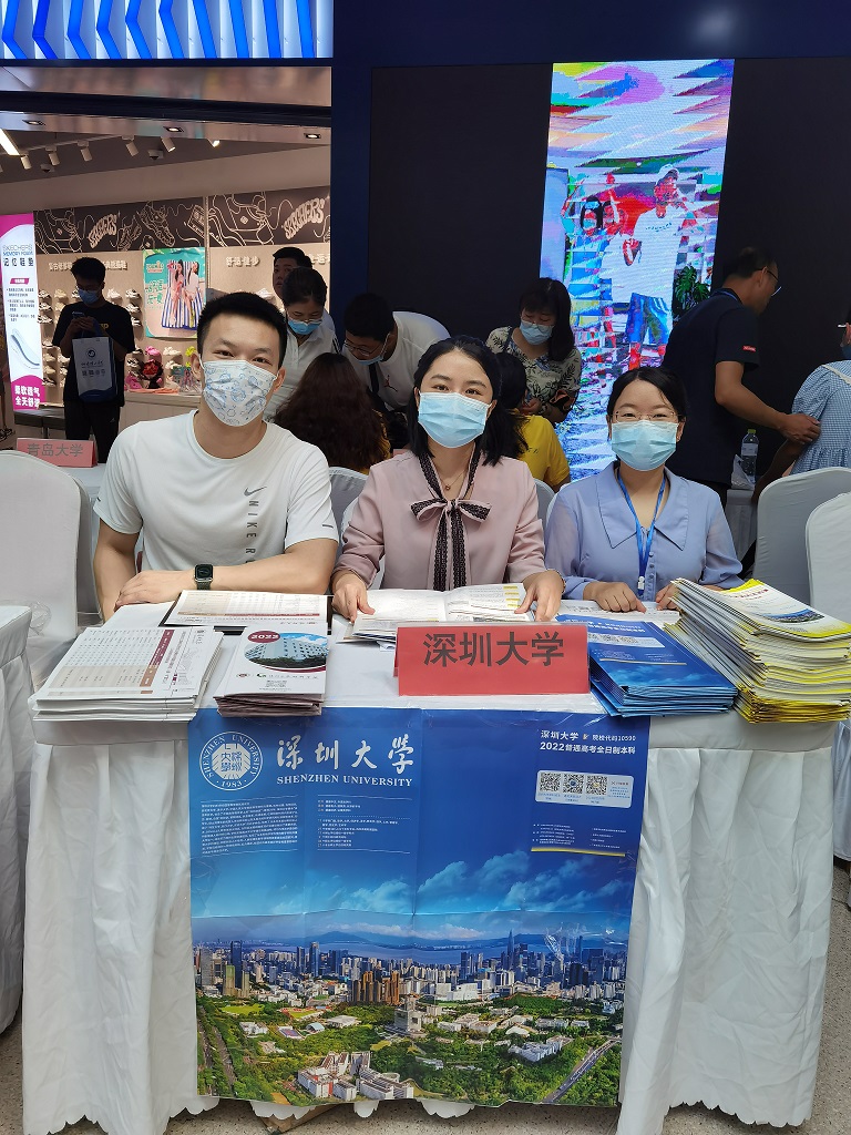 6月26日,刘卓鑫、韩婷、黄妍斐老师在山东大型高考招生咨询会青岛综合大场现场为考生及家长介绍深大